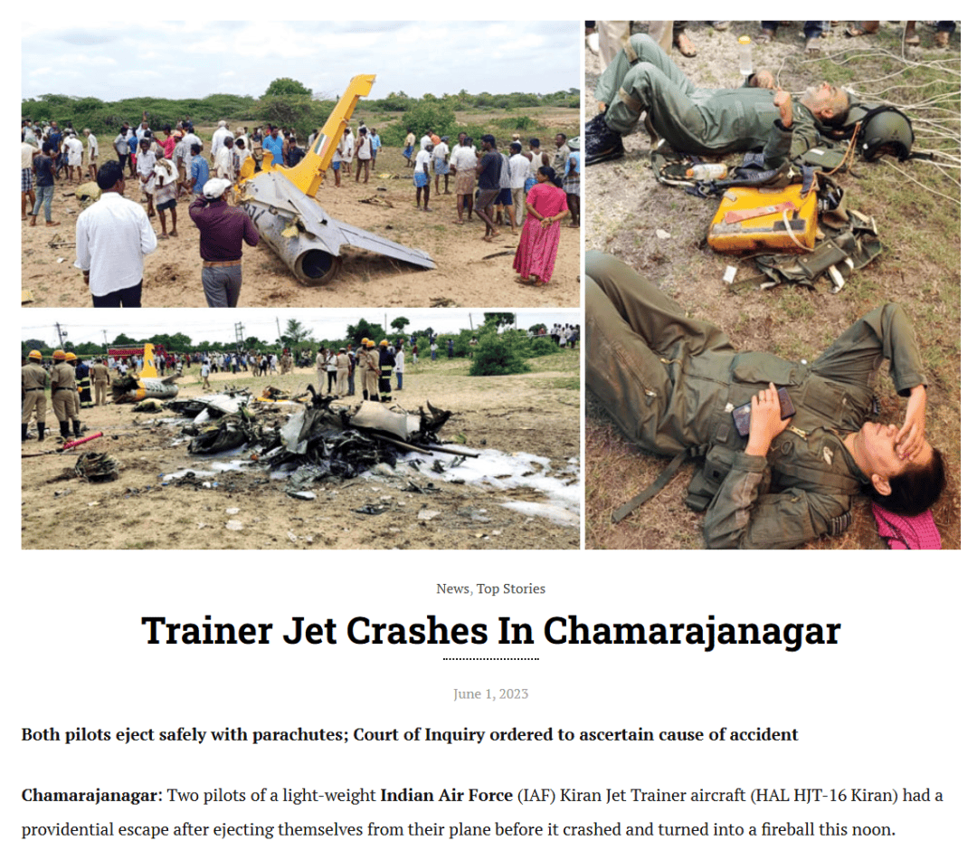 根据报道,2023年6月1日,印度空军一架轻型“光线”喷气教练机(HAL HJT-16)在印度南部查马拉贾纳加尔县的博加普拉村附近坠毁,机上的两名飞行员在飞机起火前弹射逃生皇冠信用盘 。
