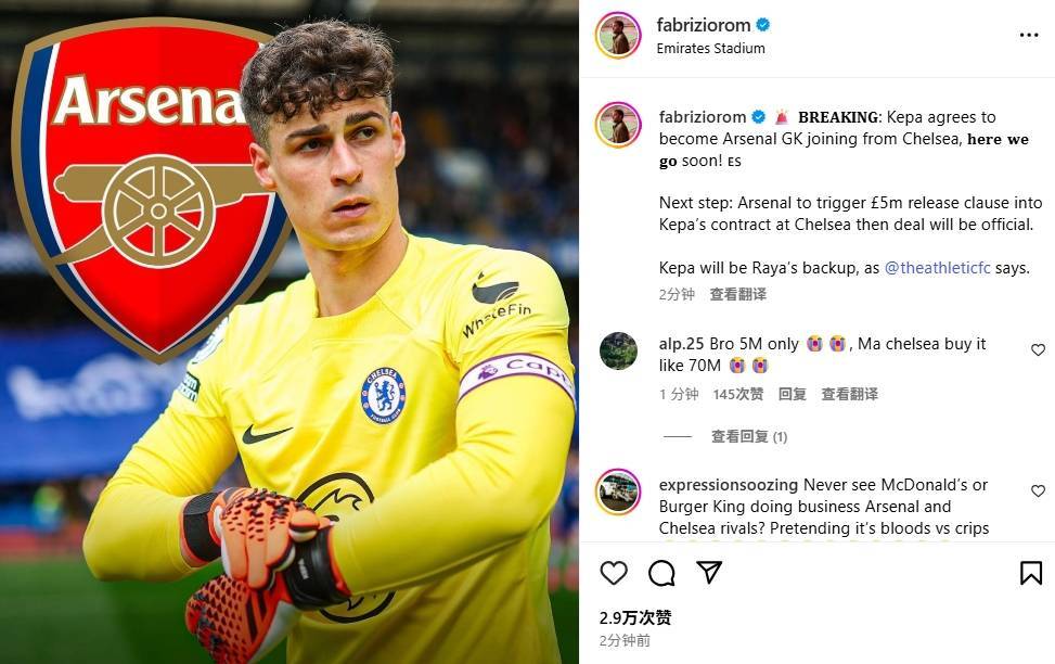 罗马诺表示:凯帕已经同意从切尔西转投阿森纳,Here We Go Soon!接下来阿森纳将触发凯帕合同中500万镑的解约条款,将这笔交易正式化皇冠信用網足球代理 。